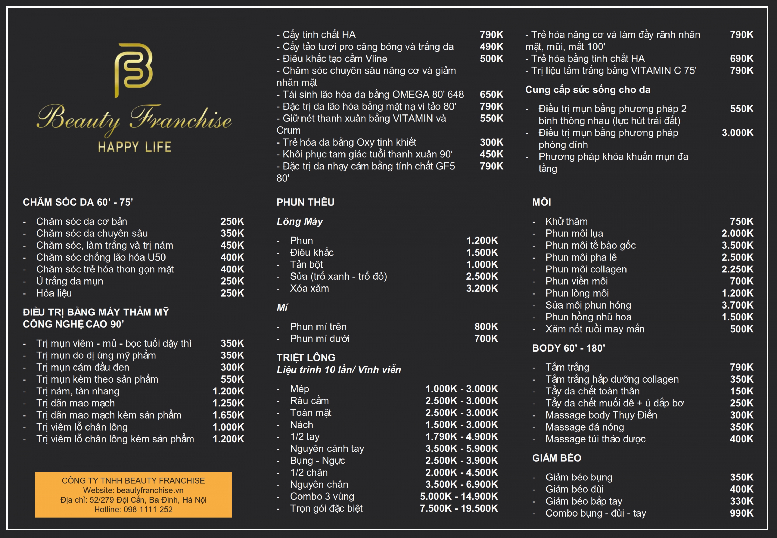 BEAUTY FRANSHISE TRÂN TRỌNG GỬI TỚI QUÝ KHÁCH HÀNG BẢNG GIÁ DỊCH VỤ TẠI BEAUTY FRANCHISE NĂM 2020